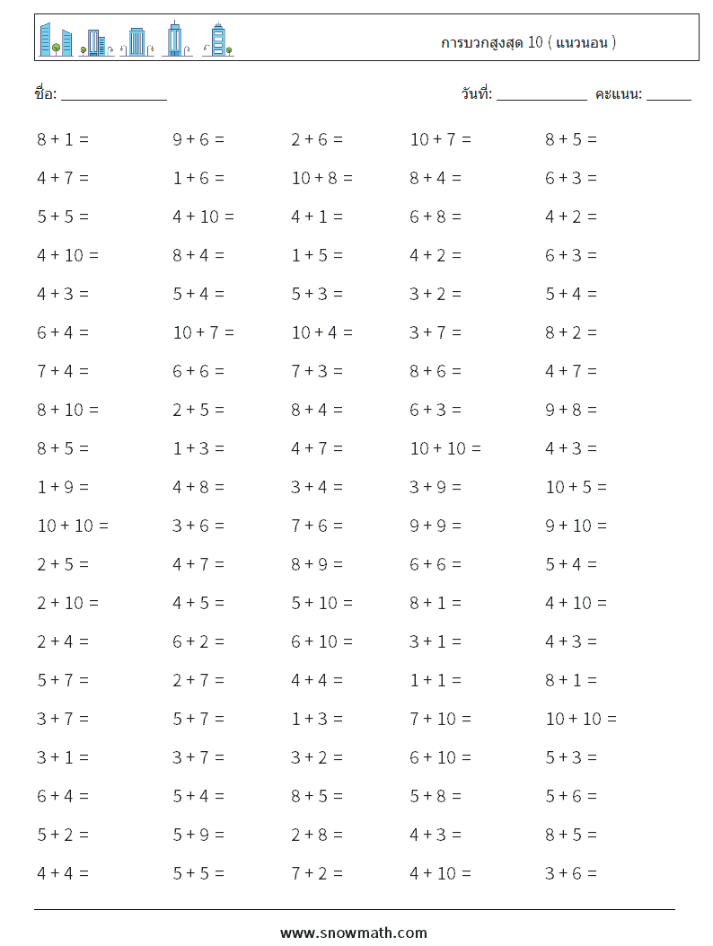 (100) การบวกสูงสุด 10 ( แนวนอน ) ใบงานคณิตศาสตร์ 5