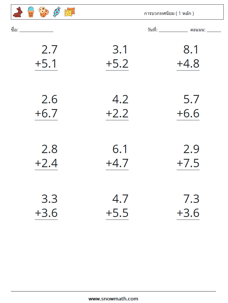 (12) การบวกทศนิยม ( 1 หลัก ) ใบงานคณิตศาสตร์ 12