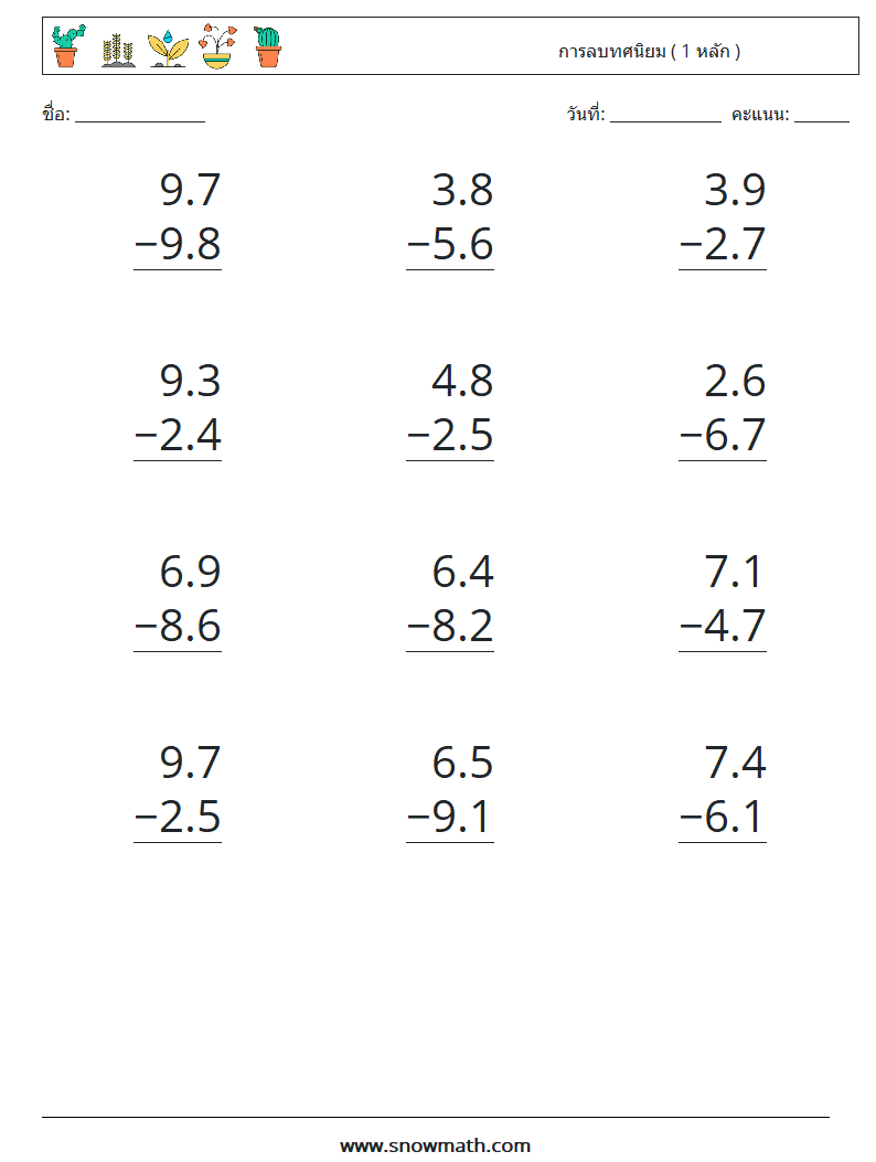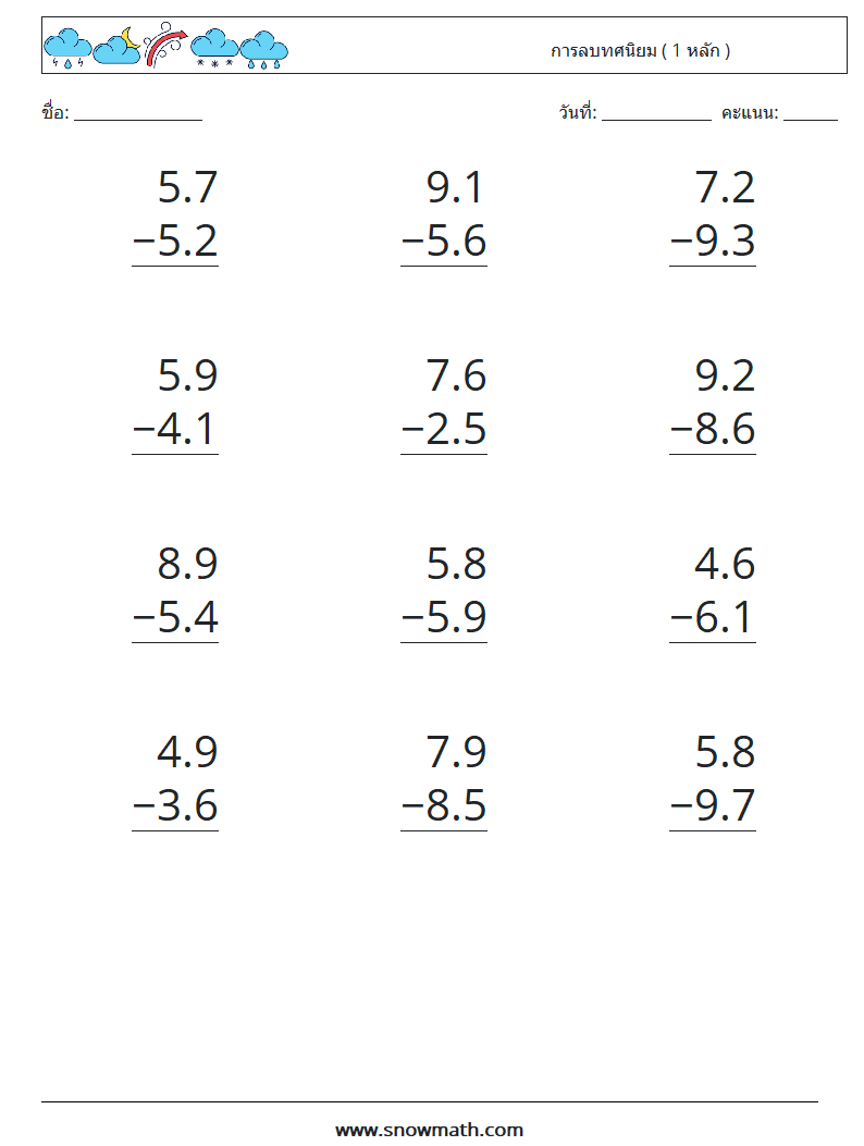(12) การลบทศนิยม ( 1 หลัก ) ใบงานคณิตศาสตร์ 12