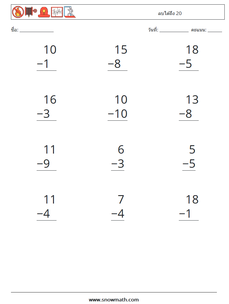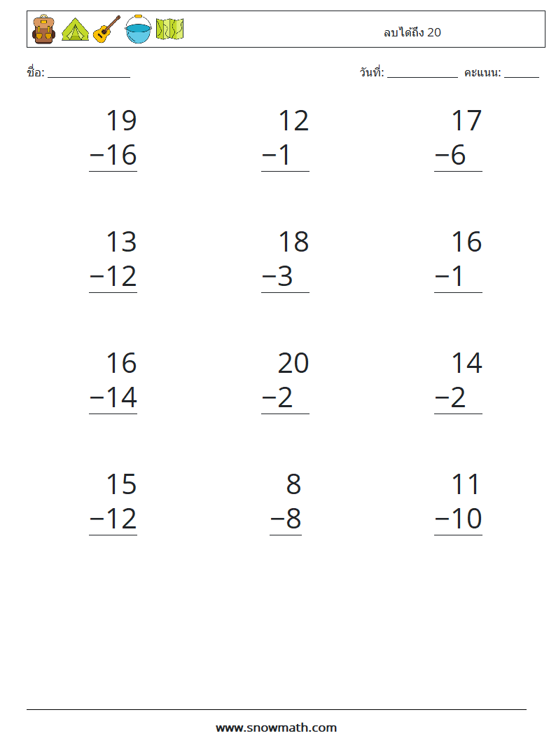(12 คำถามคณิตศาสตร์) การลบสูงสุด 20