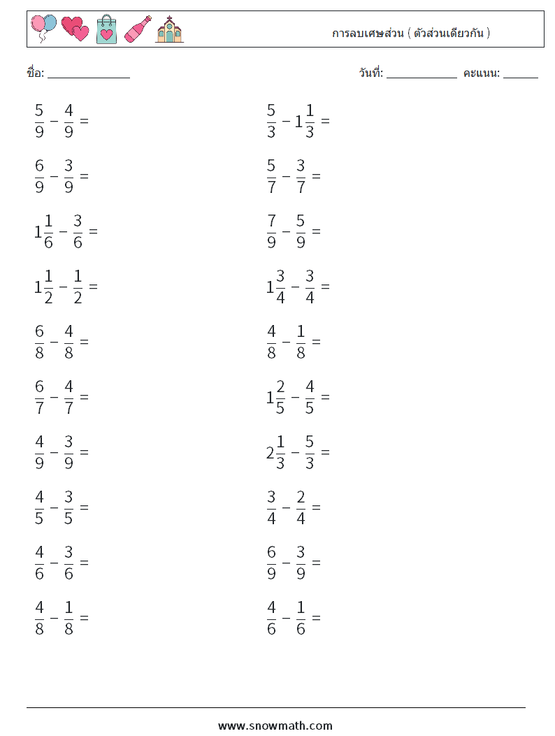 (20) การลบเศษส่วน ( ตัวส่วนเดียวกัน ) ใบงานคณิตศาสตร์ 1