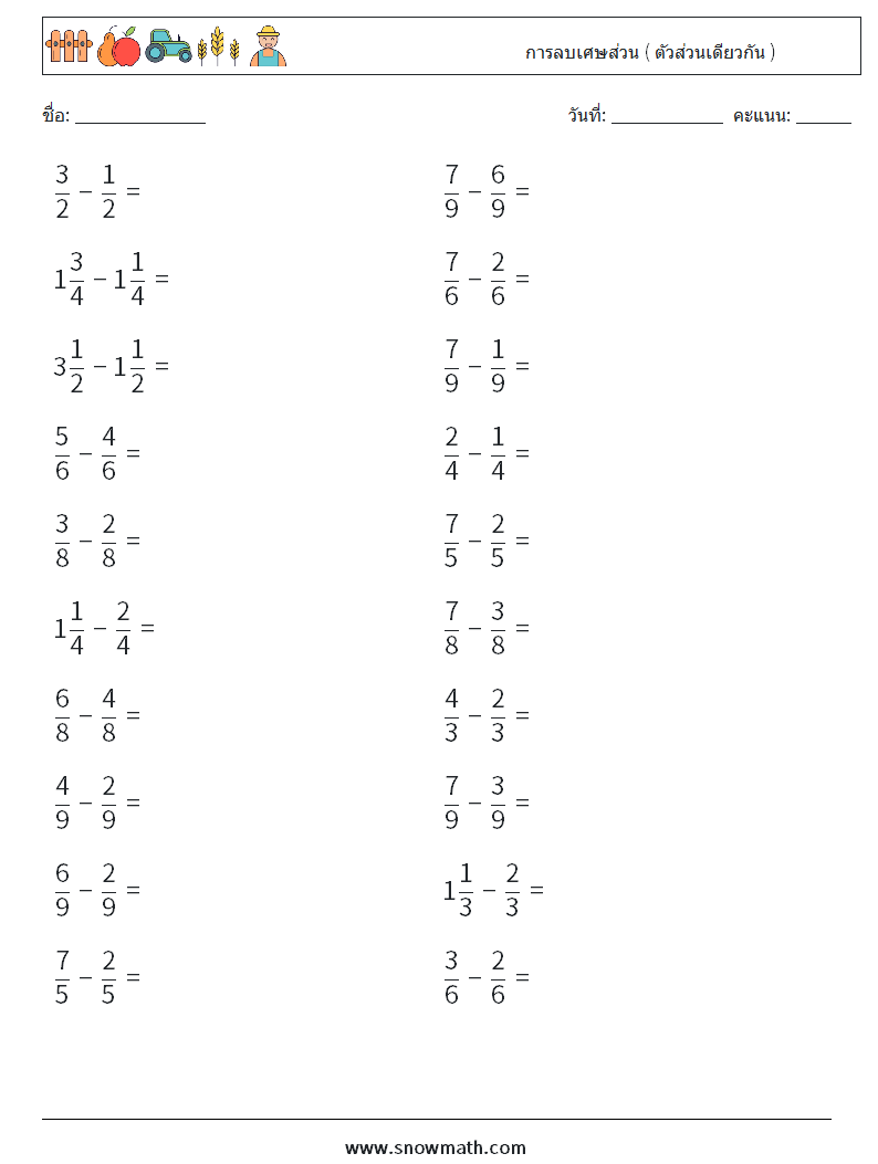 (20) การลบเศษส่วน ( ตัวส่วนเดียวกัน ) ใบงานคณิตศาสตร์ 10