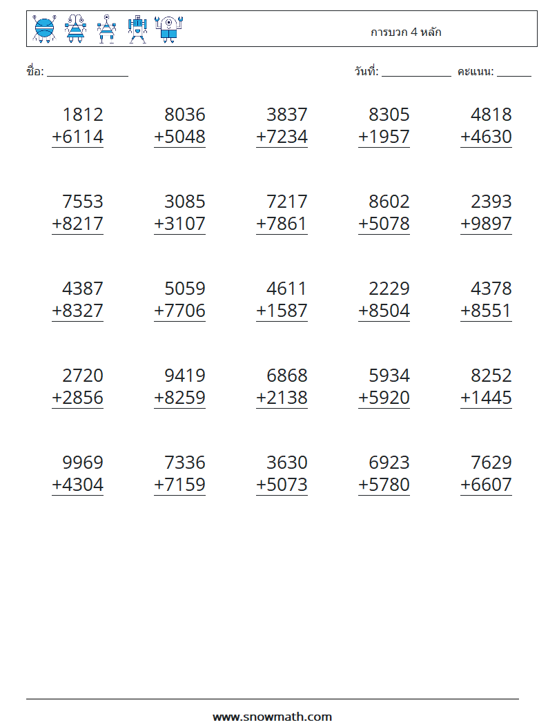 (25 คำถามคณิตศาสตร์) เรียนรู้การบวก การบวกตัวเลข 4 หลัก แผ่นงานคณิตศาสตร์ที่พิมพ์ได้