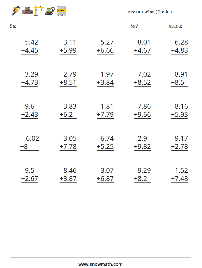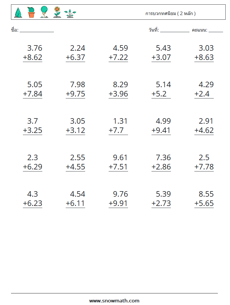 (25) การบวกทศนิยม ( 2 หลัก ) ใบงานคณิตศาสตร์ 5