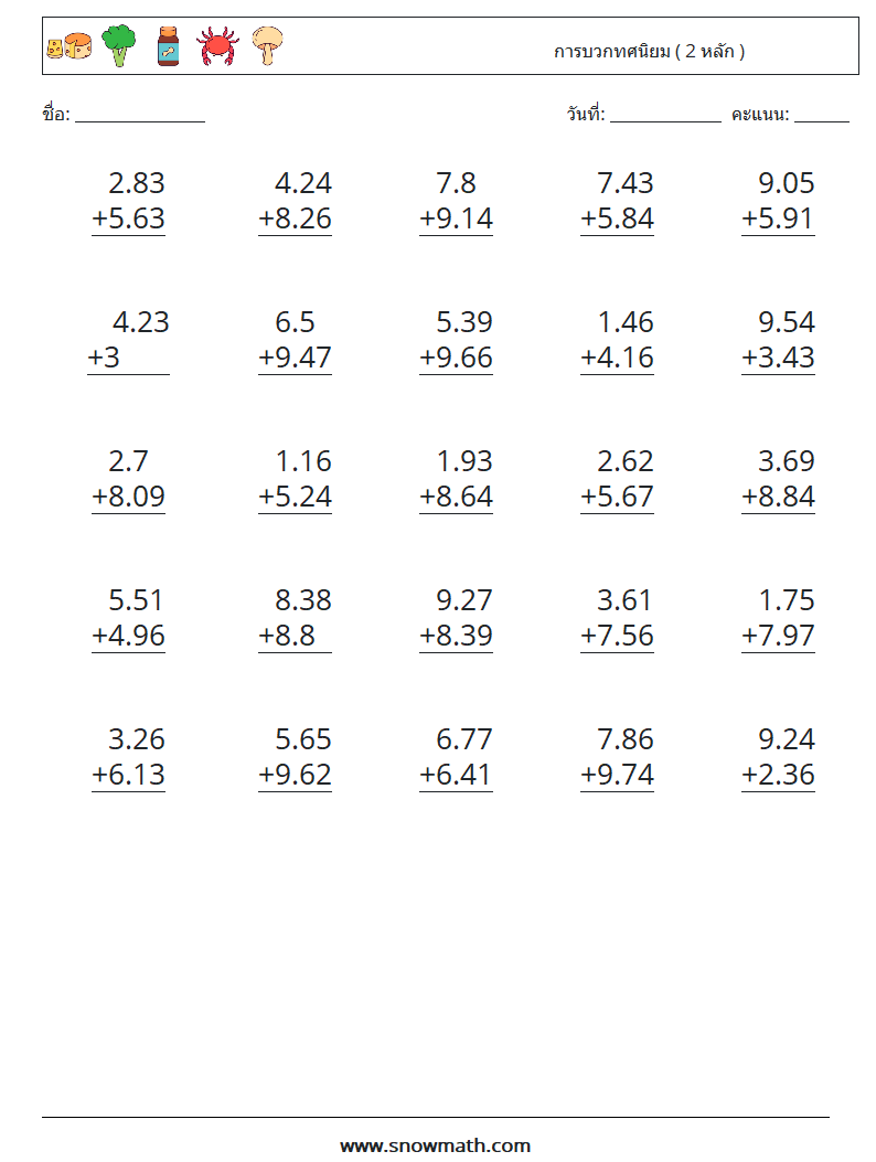 (25) การบวกทศนิยม ( 2 หลัก ) ใบงานคณิตศาสตร์ 12
