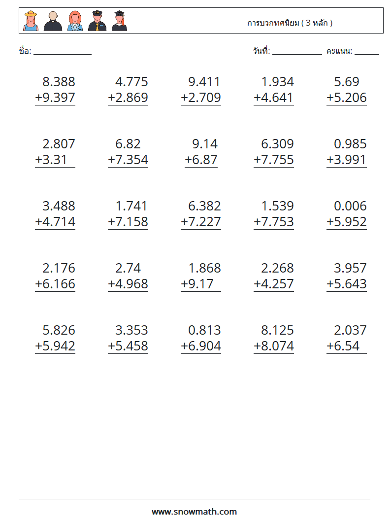 (25) การบวกทศนิยม ( 3 หลัก ) ใบงานคณิตศาสตร์ 12