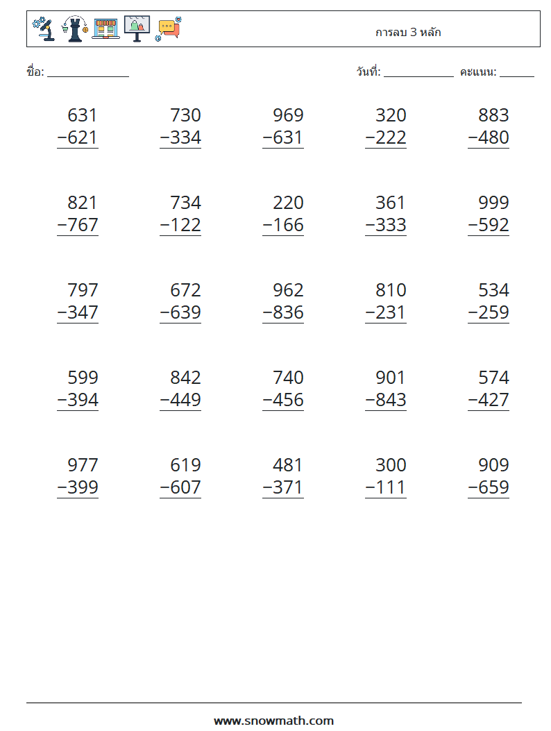 (25) การลบ 3 หลัก ใบงานคณิตศาสตร์ 3