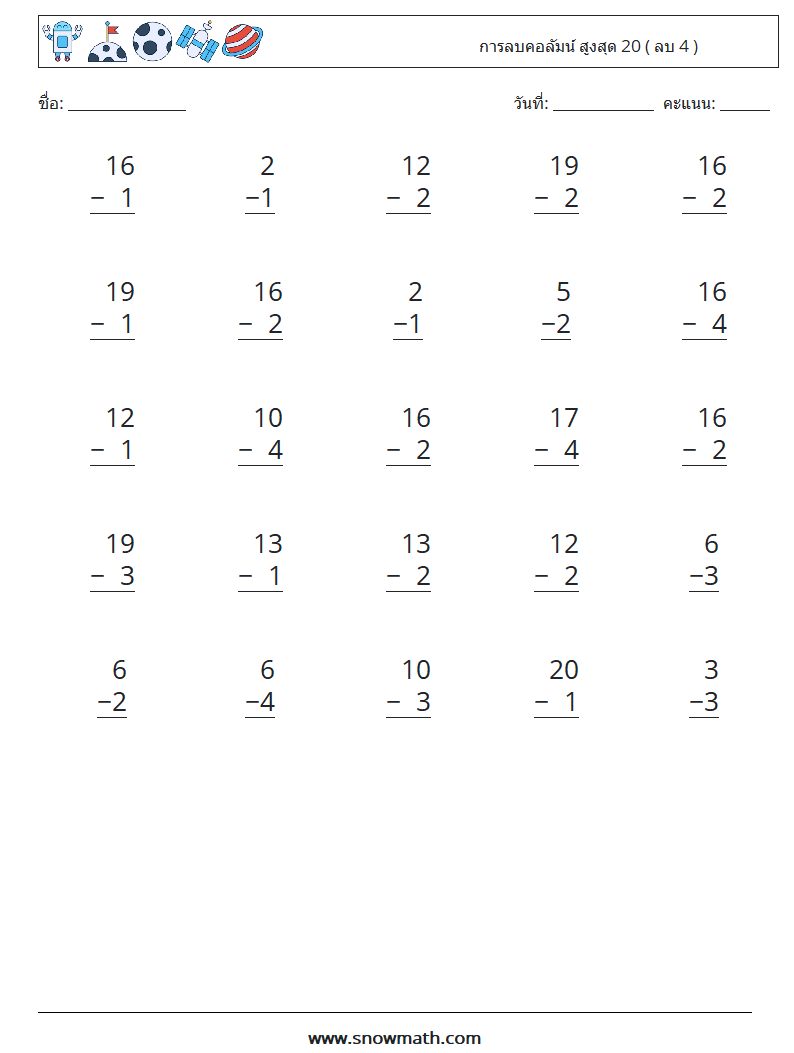 (25) การลบคอลัมน์ สูงสุด 20 ( ลบ 4 ) ใบงานคณิตศาสตร์ 4