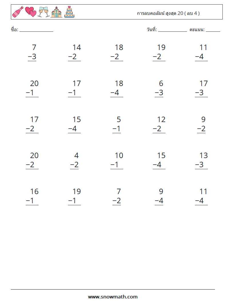 (25) การลบคอลัมน์ สูงสุด 20 ( ลบ 4 ) ใบงานคณิตศาสตร์ 12