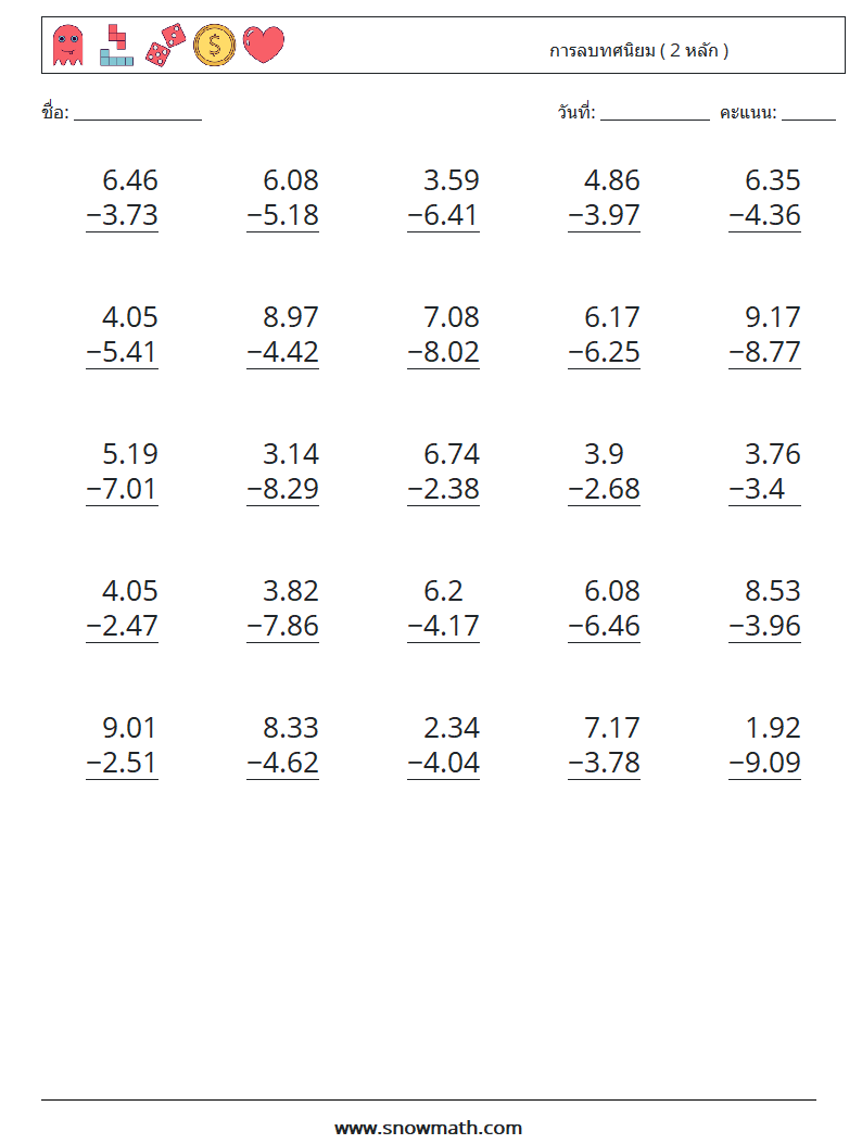 (25) การลบทศนิยม ( 2 หลัก ) ใบงานคณิตศาสตร์ 12