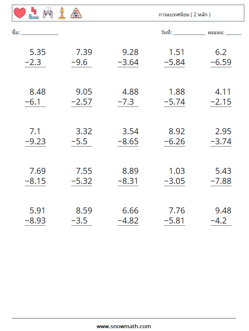 (25) การลบทศนิยม ( 2 หลัก ) ใบงานคณิตศาสตร์ 15