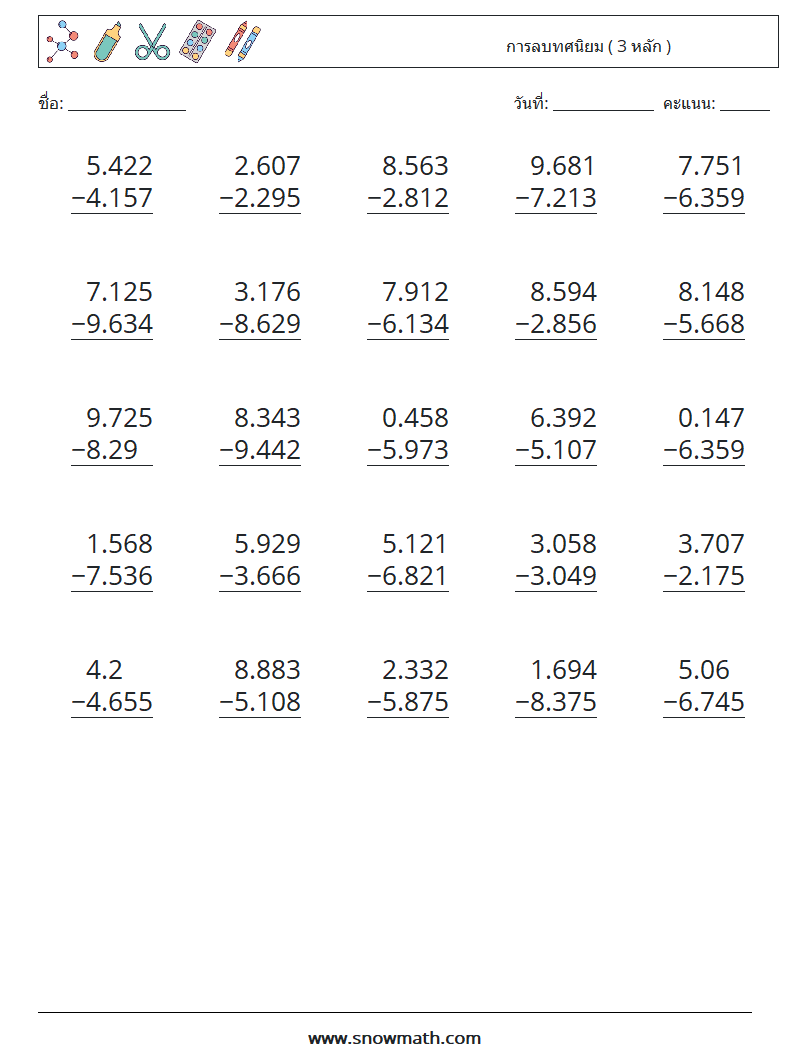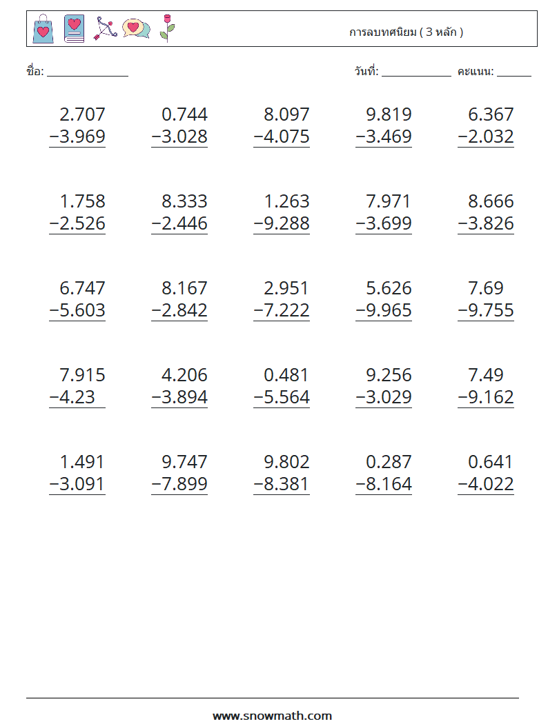 (25) การลบทศนิยม ( 3 หลัก ) ใบงานคณิตศาสตร์ 11