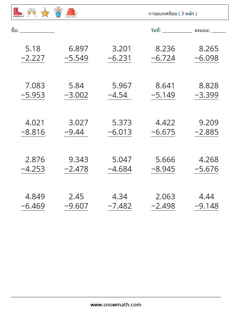(25) การลบทศนิยม ( 3 หลัก ) ใบงานคณิตศาสตร์ 13
