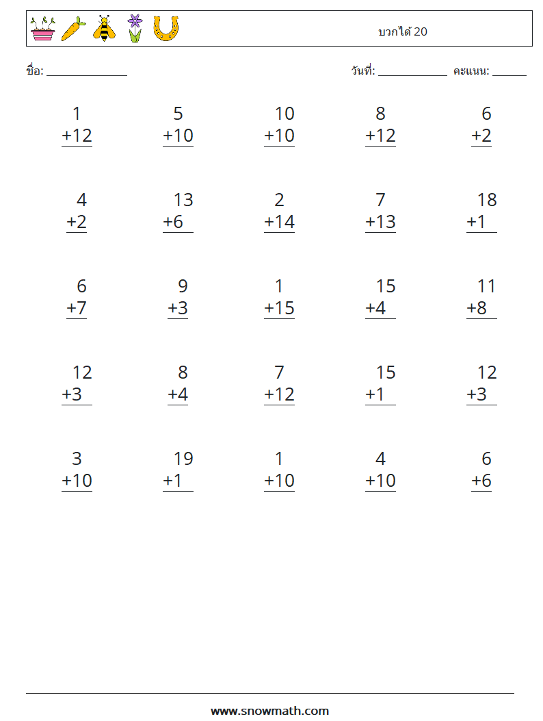 (25 คำถามทางคณิตศาสตร์) ฝึกบวกได้ถึง 20 แผ่นงานคณิตศาสตร์ฟรีสำหรับพิมพ์