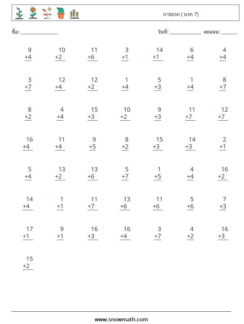 (50) การบวก ( บวก 7) ใบงานคณิตศาสตร์ 15