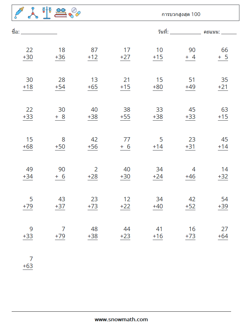 (50) การบวกสูงสุด 100 ใบงานคณิตศาสตร์ 7
