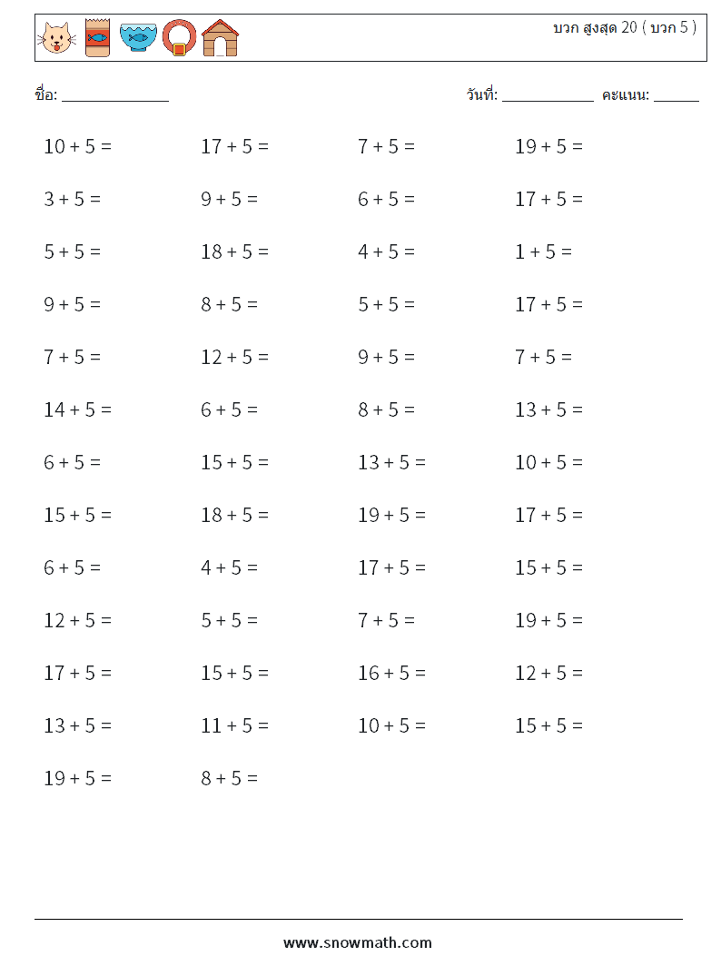 (50 คำถามคณิตศาสตร์) บวกสูงสุด 20 ดาวน์โหลดแผ่นงานคณิตศาสตร์ฟรี เพิ่ม 5