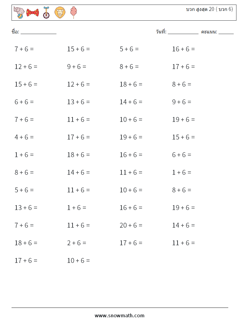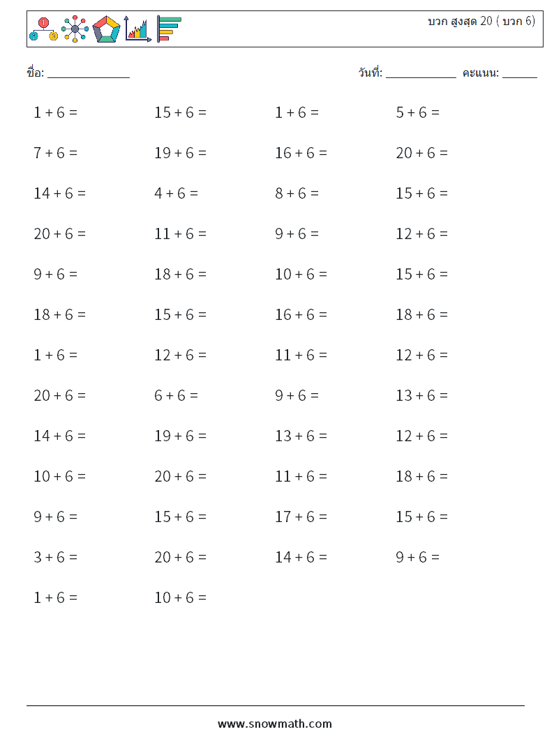 (50 คำถามคณิตศาสตร์) บวกภายใน 20 ดาวน์โหลดใบงานคณิตศาสตร์ บวก 6