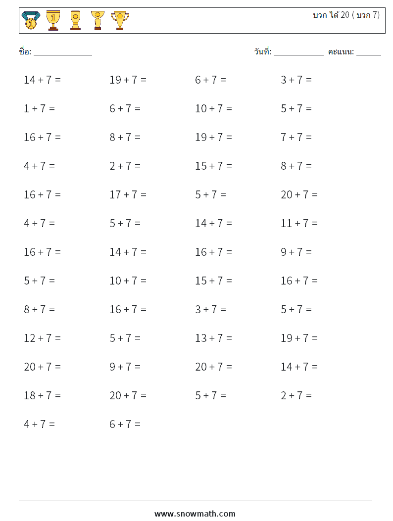 (50 คำถามคณิตศาสตร์) บวกได้สูงสุด 20 ข้อ ดาวน์โหลดเวิร์กชีตคณิตศาสตร์ บวก 7
