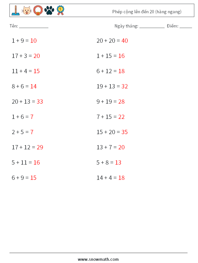 (20) Phép cộng lên đến 20 (hàng ngang)