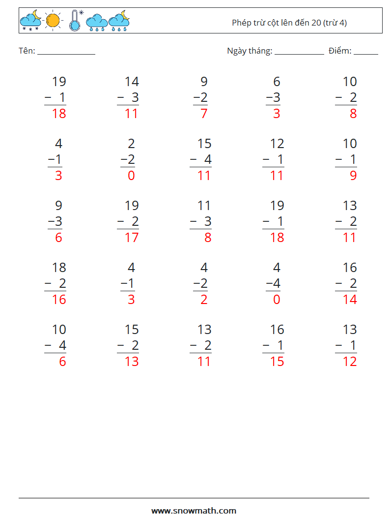 (25) Phép trừ cột lên đến 20 (trừ 4)