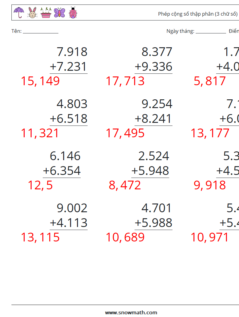 (12) Phép cộng số thập phân (3 chữ số)
