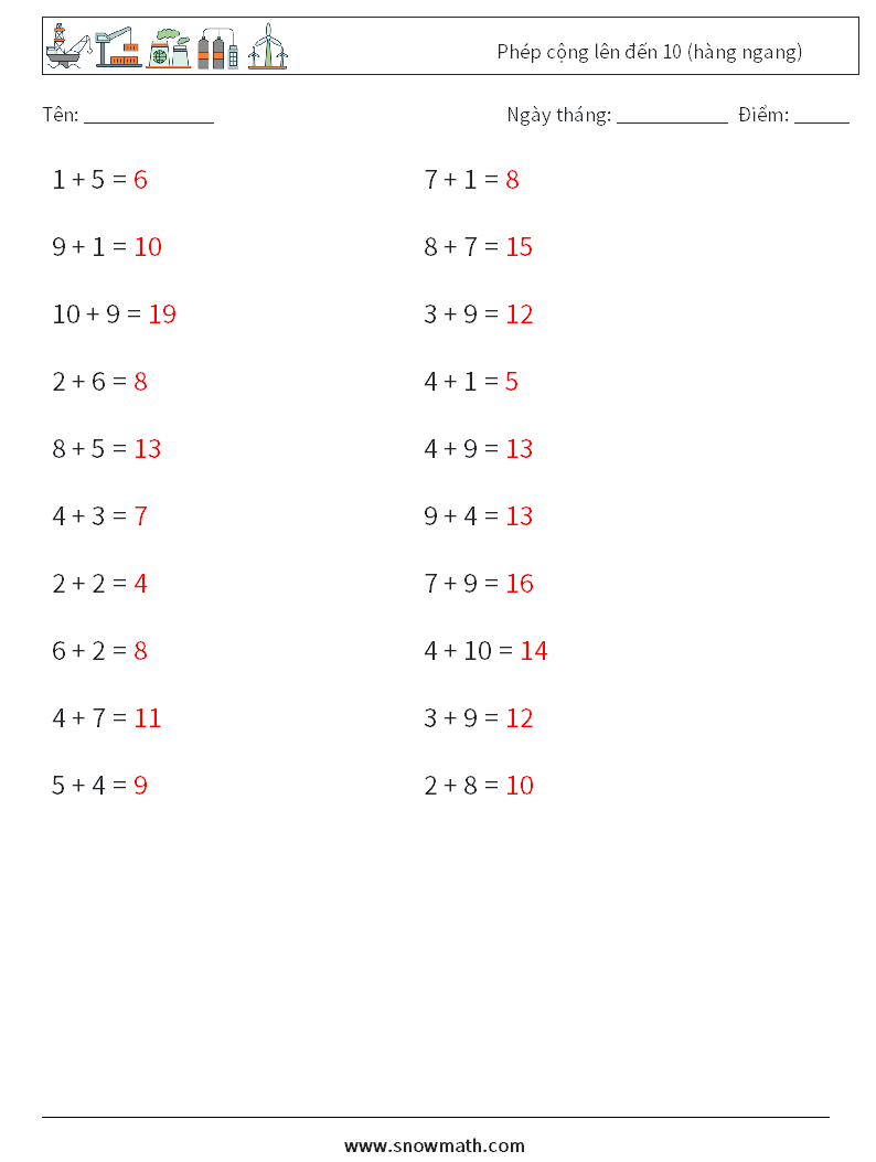 (20) Phép cộng lên đến 10 (hàng ngang)