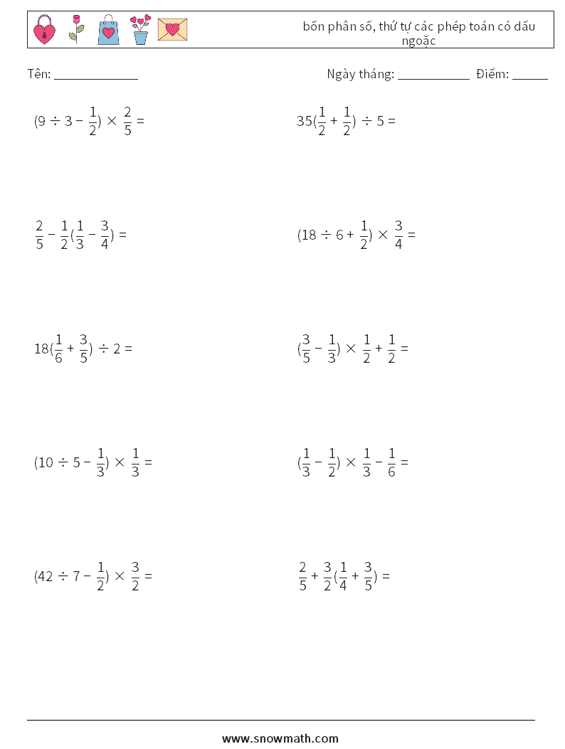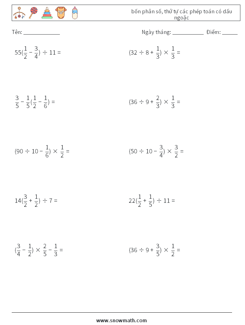 (10) bốn phân số, thứ tự các phép toán có dấu ngoặc