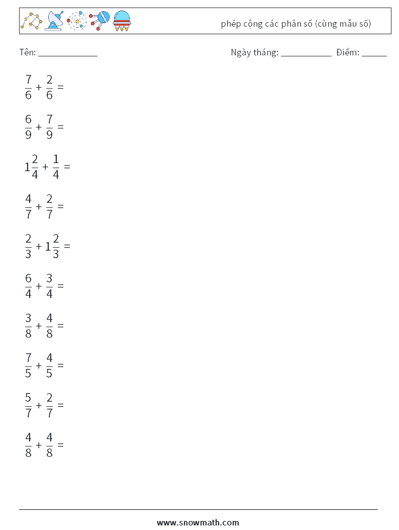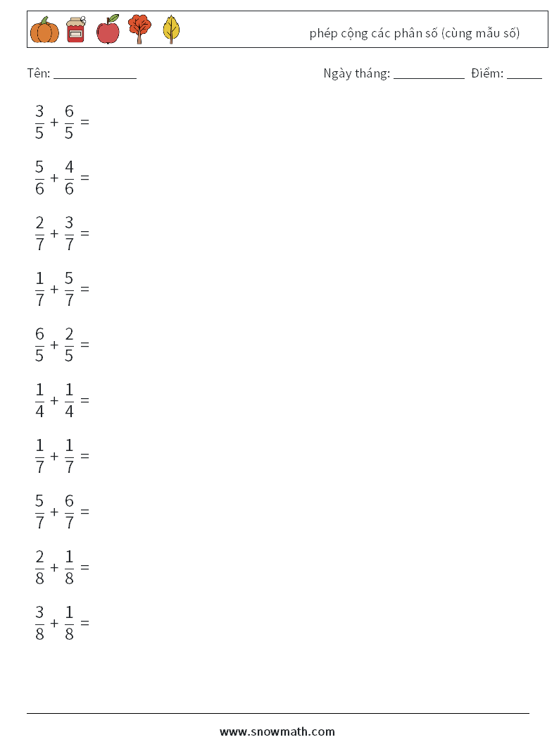(10) phép cộng các phân số (cùng mẫu số) Bảng tính toán học 5