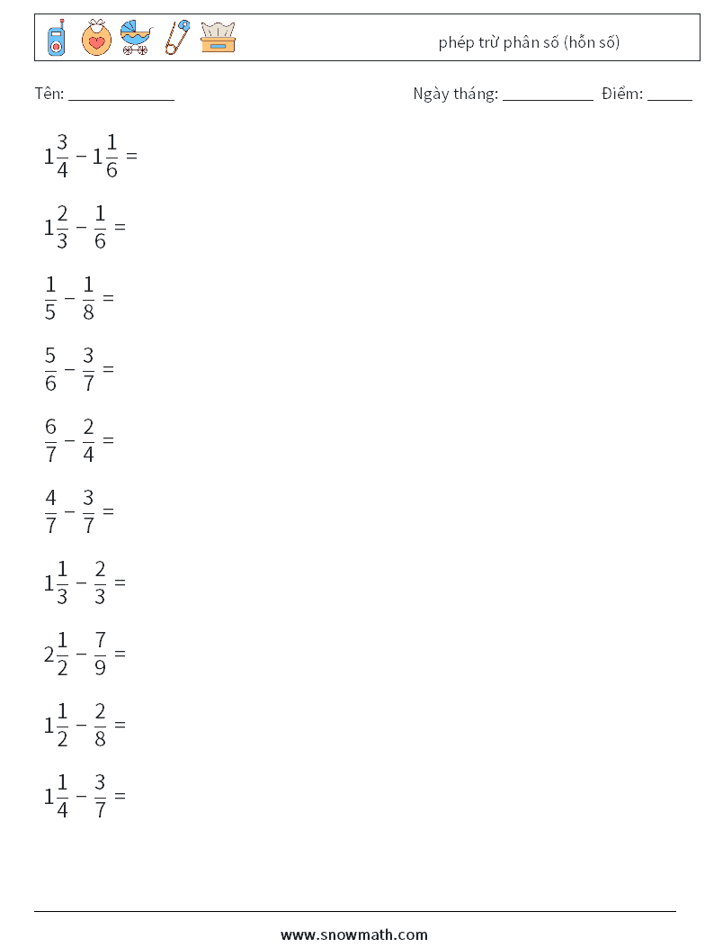 (10) phép trừ phân số (hỗn số) Bảng tính toán học 1