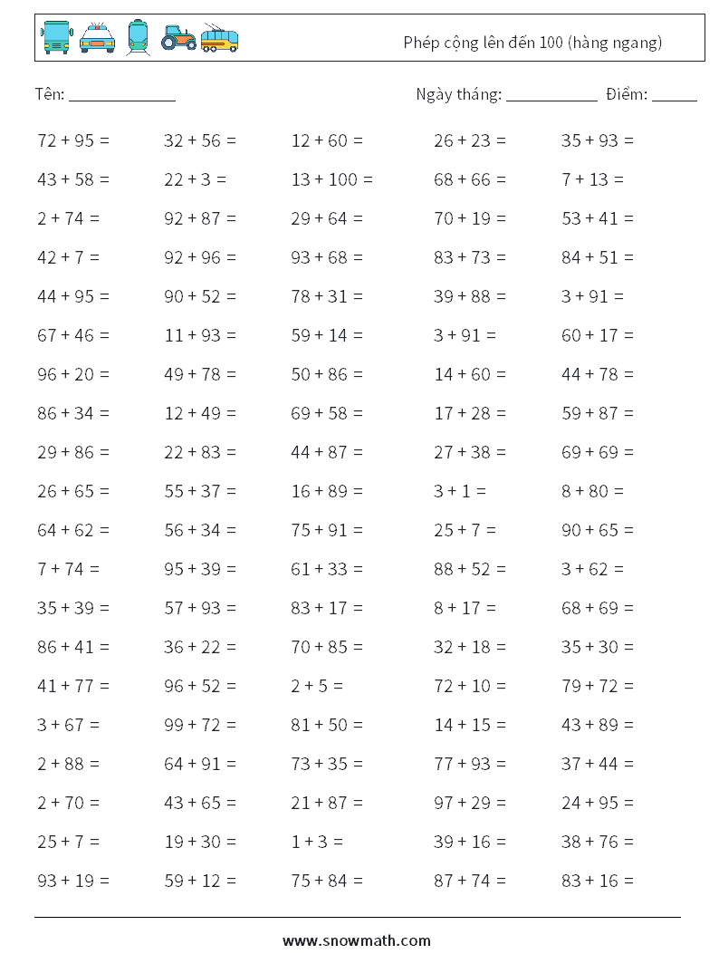 (100) Phép cộng lên đến 100 (hàng ngang)