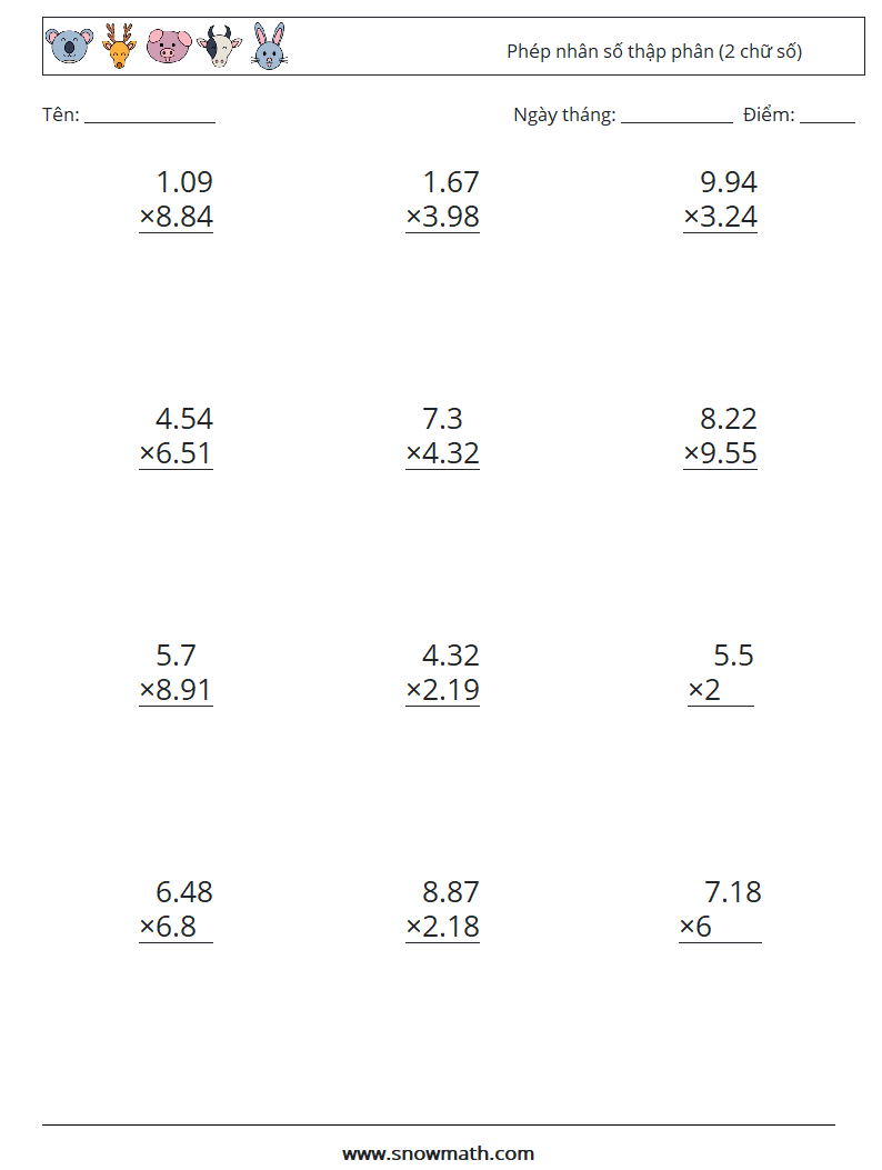 (12) Phép nhân số thập phân (2 chữ số) Bảng tính toán học 10