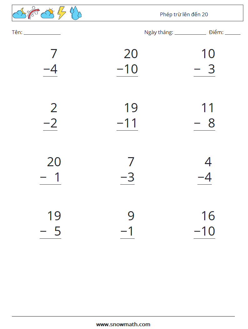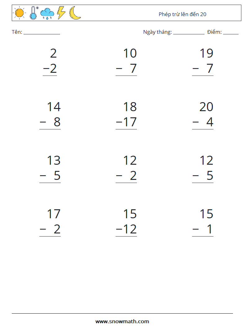 (12 câu hỏi toán) Phép trừ lên đến 20