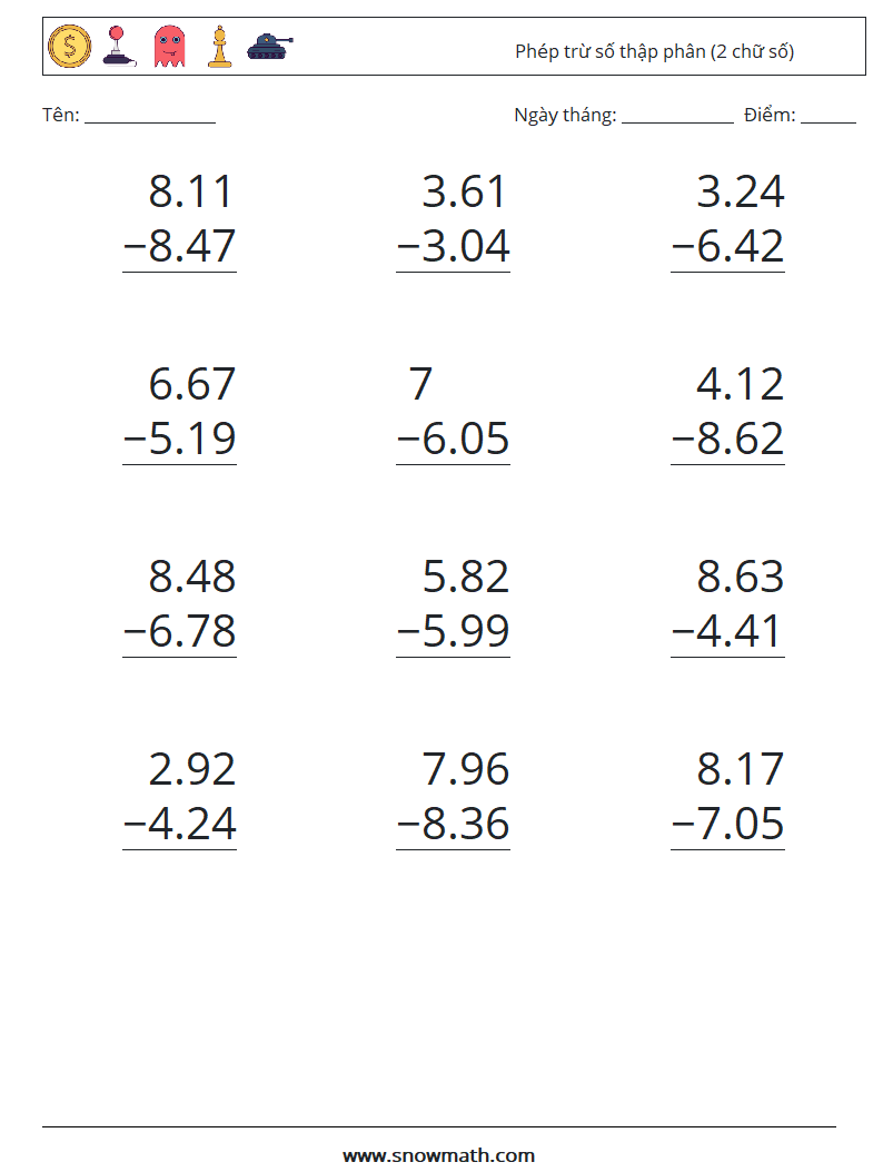 (12) Phép trừ số thập phân (2 chữ số) Bảng tính toán học 8