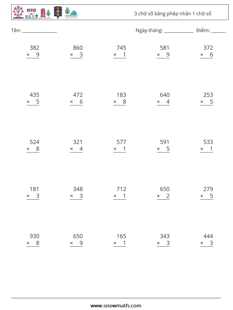 (25) 3 chữ số bằng phép nhân 1 chữ số Bảng tính toán học 1