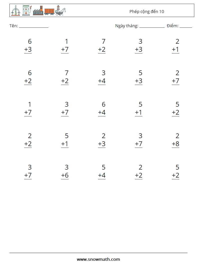 (25 câu hỏi toán) Thực hành Phép cộng đến 10