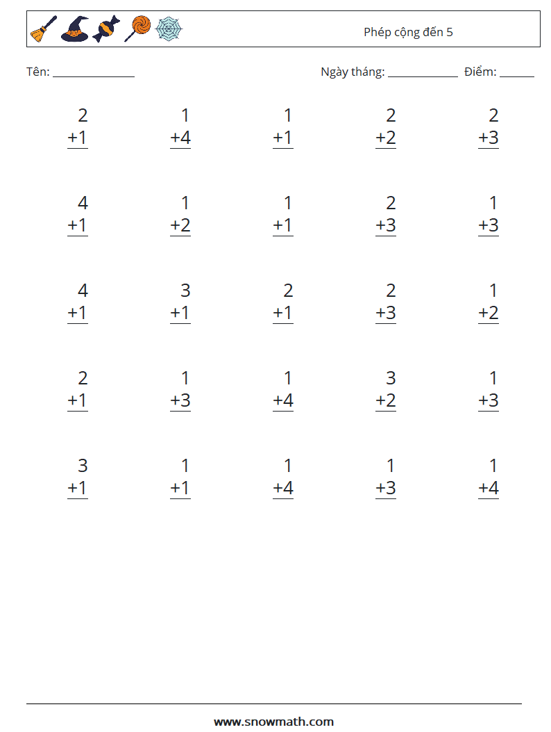(25) Phép cộng đến 5 Bảng tính toán học 3