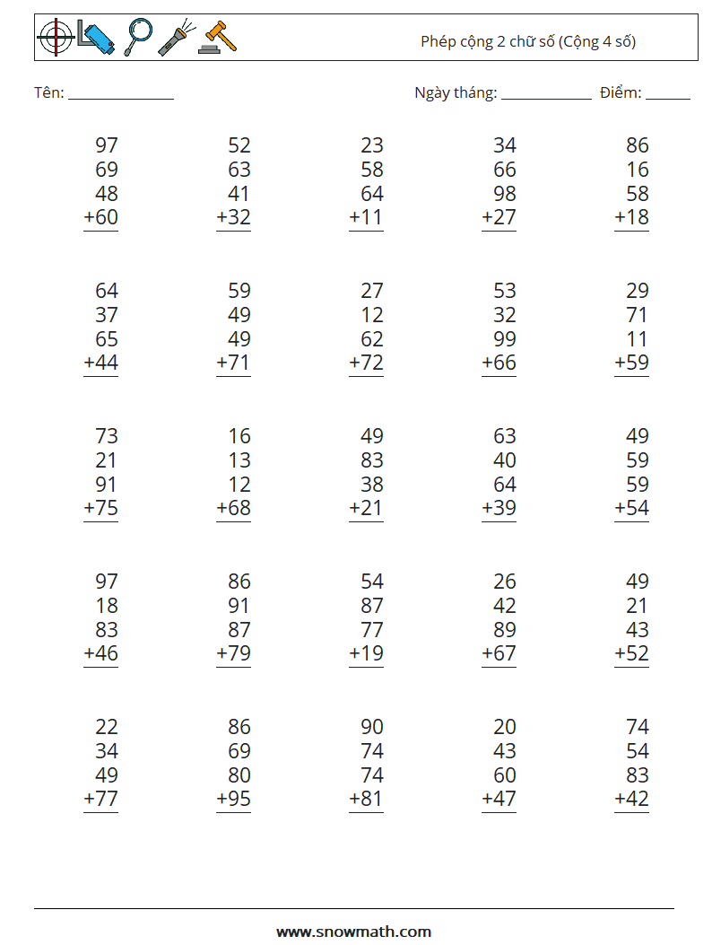 (25 câu hỏi toán) Học phép cộng, phép cộng bốn số có 2 chữ số, bảng tính toán in được.