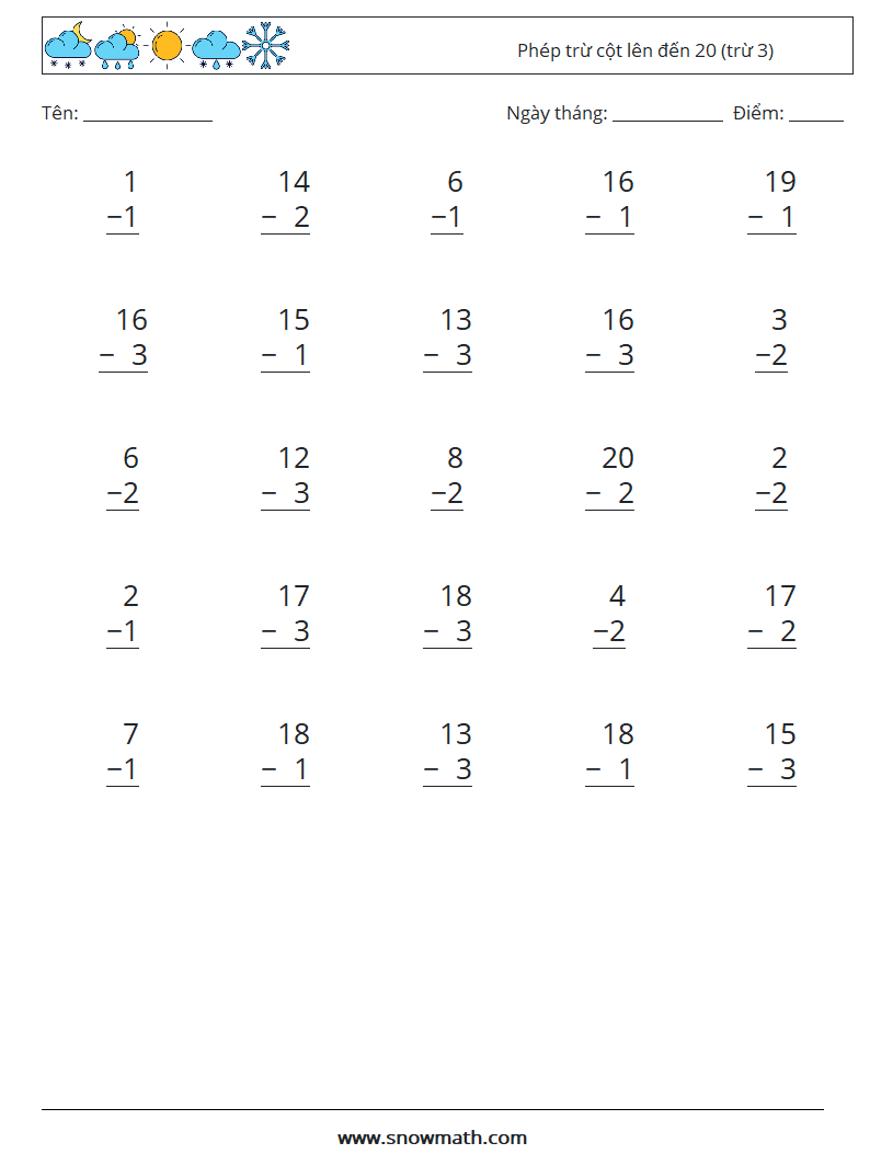 (25) Phép trừ cột lên đến 20 (trừ 3) Bảng tính toán học 14