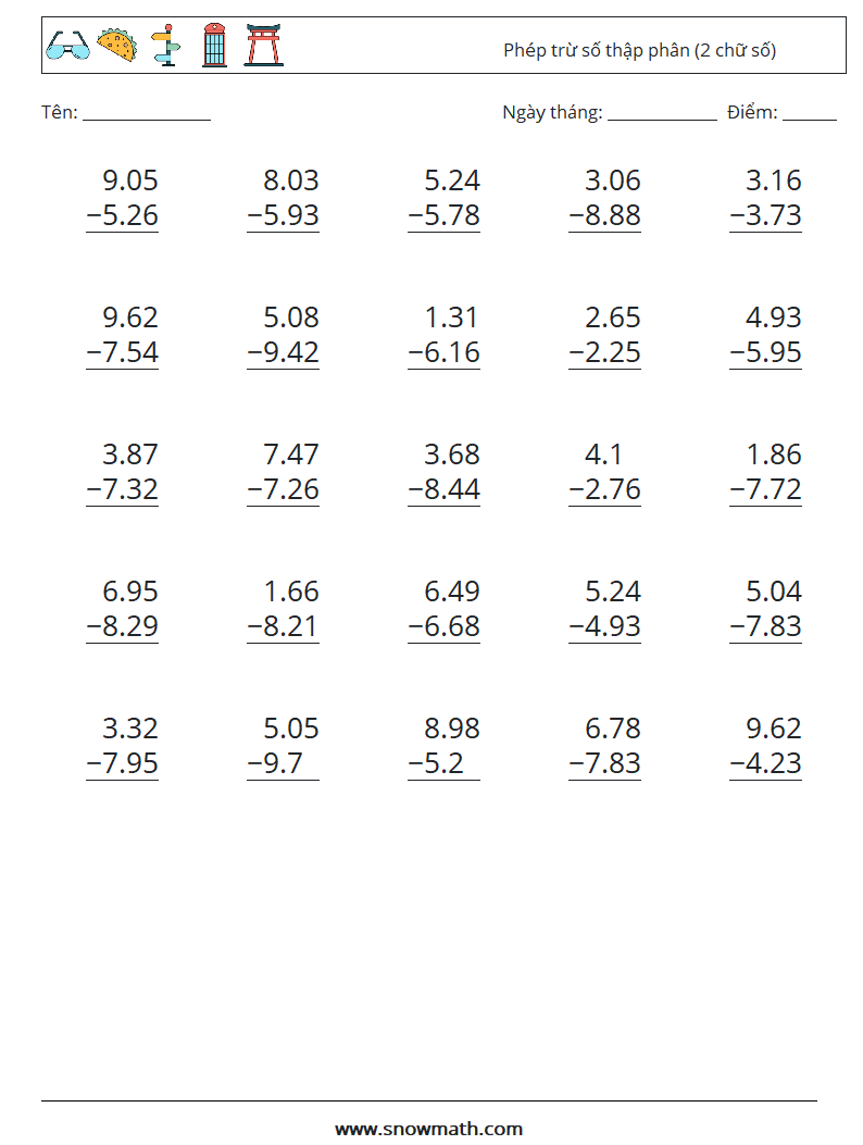 (25) Phép trừ số thập phân (2 chữ số) Bảng tính toán học 3