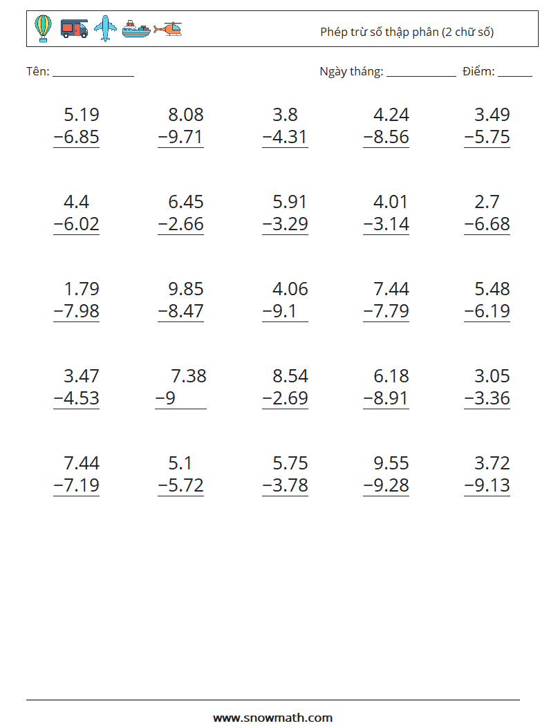 (25) Phép trừ số thập phân (2 chữ số) Bảng tính toán học 2