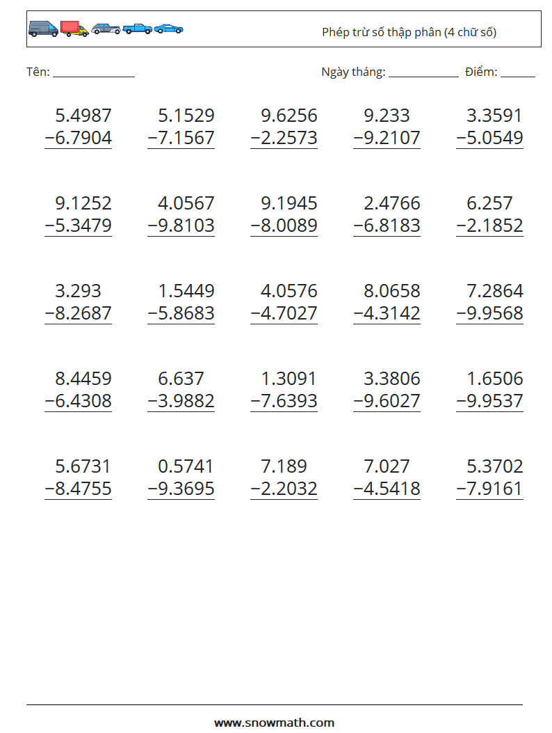 (25) Phép trừ số thập phân (4 chữ số) Bảng tính toán học 5