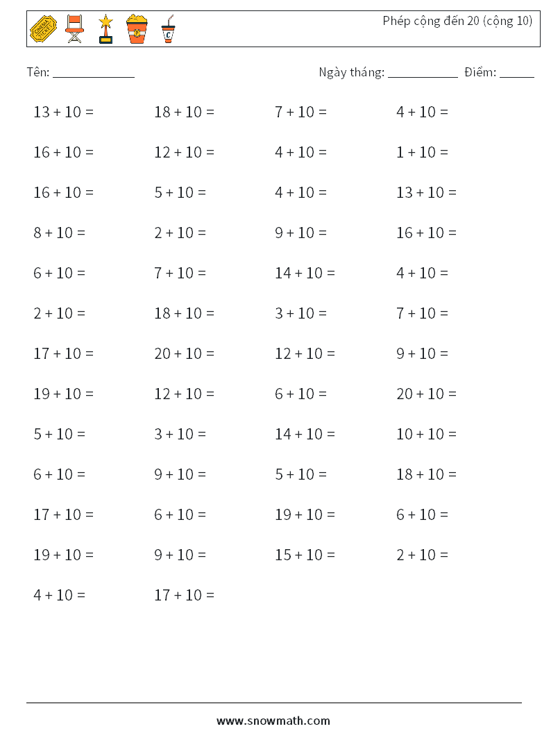 (50 câu toán) Phép cộng trong phạm vi 20, tải bảng tính toán cộng 10