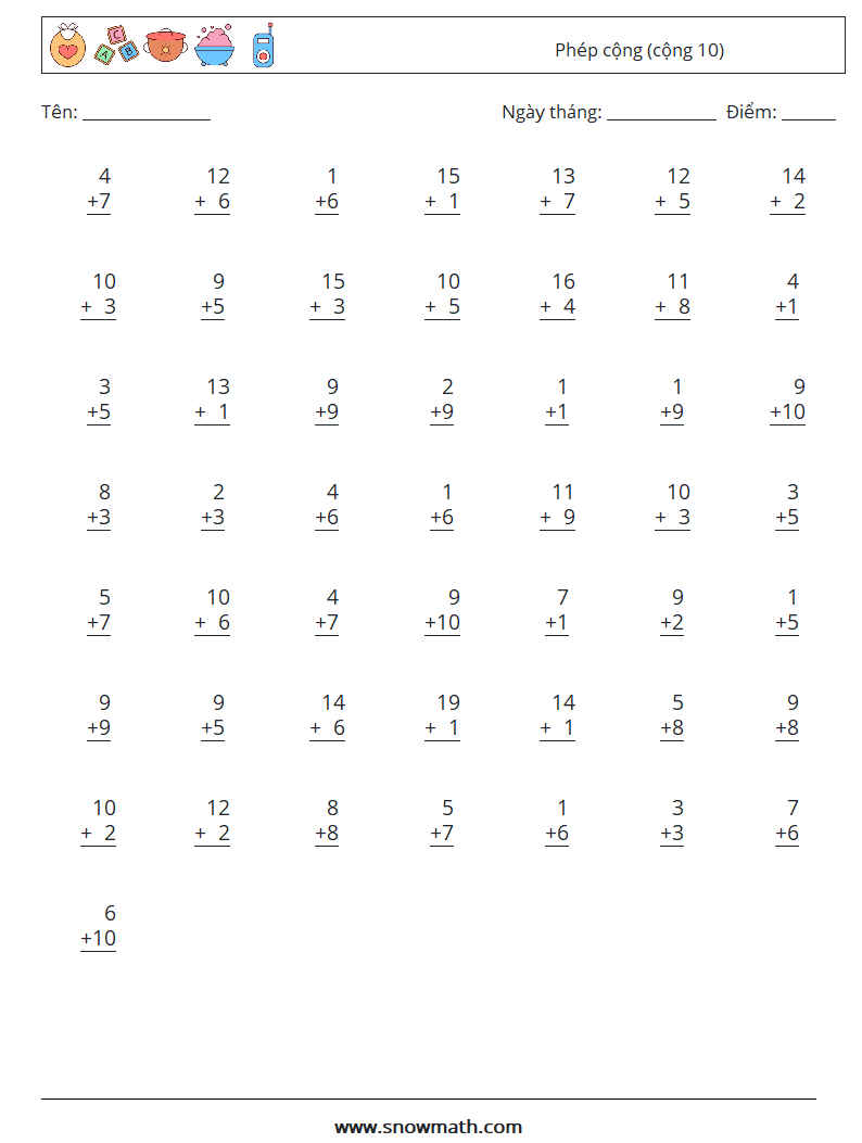 (50) Phép cộng (cộng 10) Bảng tính toán học 15