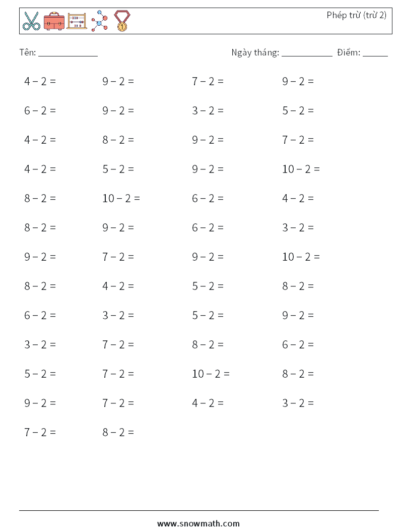 (50) Phép trừ (trừ 2) Bảng tính toán học 7