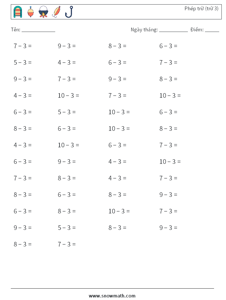 (50) Phép trừ (trừ 3) Bảng tính toán học 7