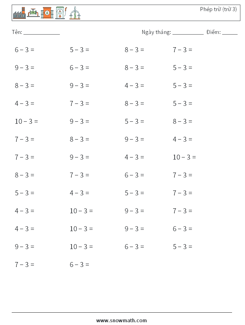 (50) Phép trừ (trừ 3) Bảng tính toán học 8