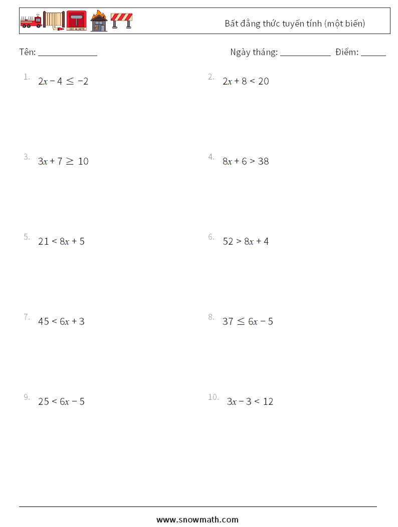 Bất đẳng thức tuyến tính (một biến) Bảng tính toán học 1