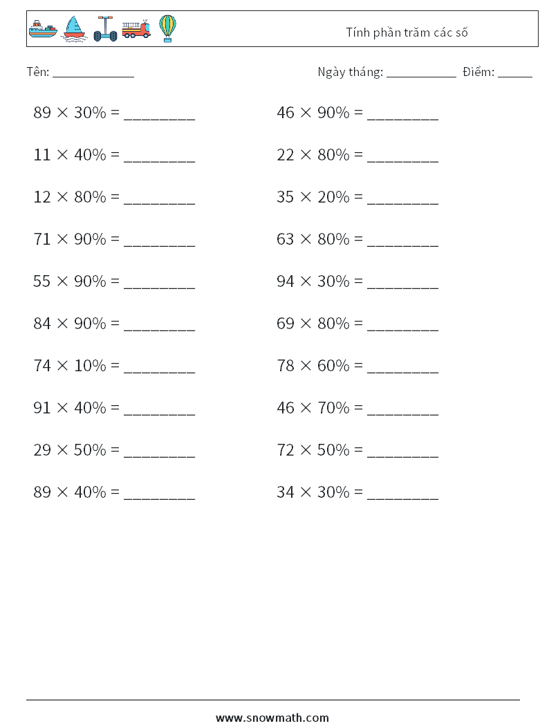 Tính Phần trăm của các số, trang tính toán học miễn phí.
