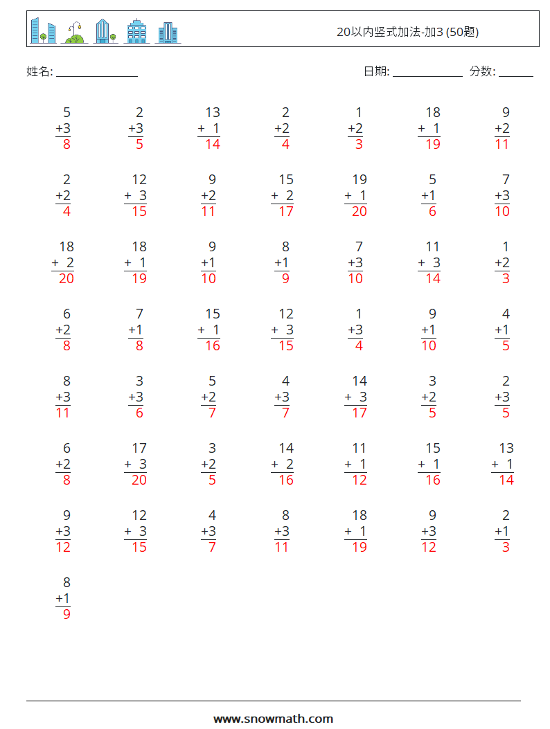 20以内竖式加法-加3 (50题)